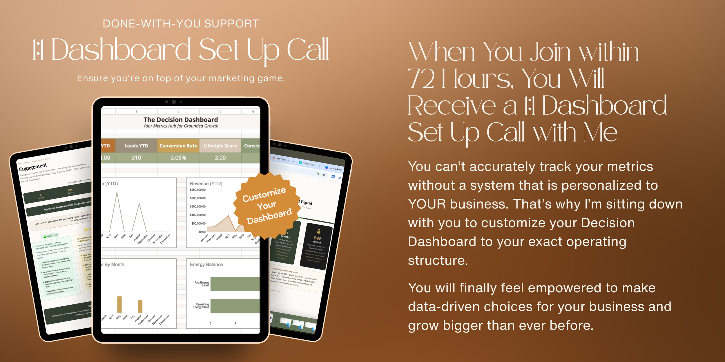 We’ll focus on a blend of business performance and life alignment. That includes things like revenue, lead flow, conversion trends, audience growth, energetic capacity, time allocation, and delivery satisfaction. You’ll learn to track both leading and lagging indicators, so you can make proactive, well-informed decisions.